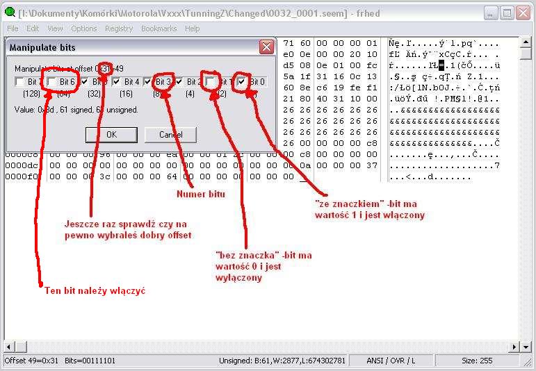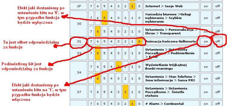Dla przykładu 'Wyłączymy animacje końcową Hellomoto'. Korzystając z tabeli widzimy, że trzeba w "offsecie 31" włączyć "bit 0" -bo wtedy funkcja będzie na 'ON' czyli włączona.