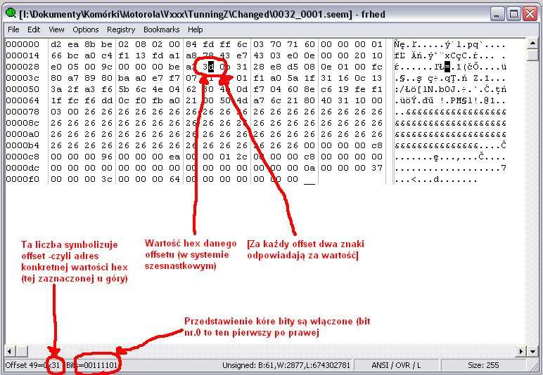Włączamy więc program Frhed. I szukamy offsetu 31. Trzeba zajrzeć do części u góry po lewej. Każdy offset składa się z dwóch znaków-jest to jego wartość. Jednak to czego my szukamy czyli "31" nie jest wartością offsetu ale jego adresem. Adres ten pokazuje się na samym dole po lewej (zobacz na obrazku). Jak sami zauważycie po wybraniu jakiegoś offsetu (pary znaków) adres się zmienia.